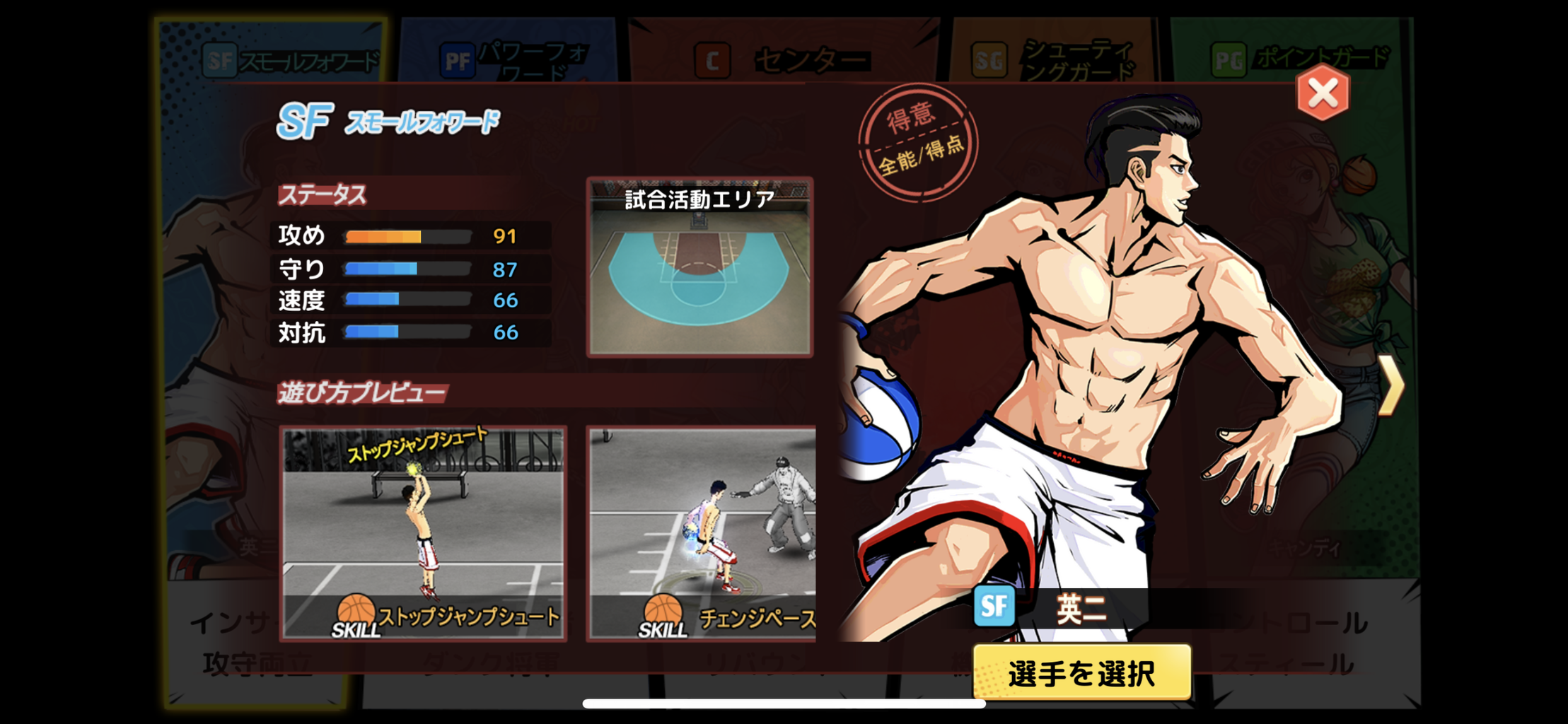 『SF(スモールフォワード)』・・・主に2Pやレイアップで得点する選手ではあるが意外と3Pも入る育てていくとまさに攻めの要になるポジション。しかし背があまり高くないためリバウンドは不得意(-.-;)