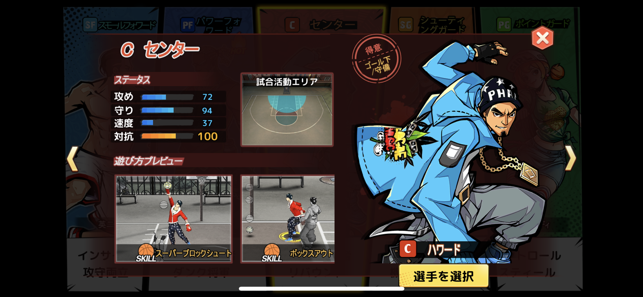 『C(センター)』・・・背が高くゴール下でリバウンドを取るのが得意なポジション。ブロック値も高い選手が多いので相手の動きを止めるのが好きな方にオススメ!